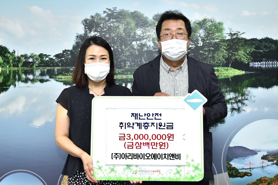 28일에는 (주)아리바이오에이치앤비(대표 이정옥)이 시청 시장실을 방문하여 지원금 3백만 원을 전달했다.