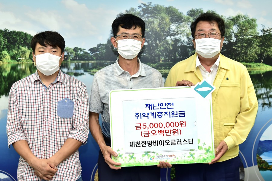 먼저, 지난 26일 제천한방바이오클러스터 기업체(회장 이원재)는 제천시청을 방문하여 재난안전취약계층 지원금 5백만 원을 기탁했다.