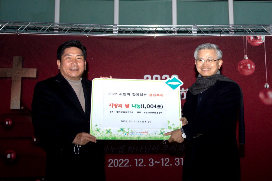 제천기독교연합회는 지난 3일 시민회관 광장에서 개최된 성탄트리 점등식에서 제천시 취약계층을 위한 사랑의 쌀 나눔 행사를 진행했다.이번 쌀 나눔은 신도들의 자발적 후원으로 백미1004포를 마련해 기탁한 것으로, 관내 겨울철 취약계층을 위해 전달될 예정이다.기독교연합회 관계자는 “신도들의 따뜻한 마음으로 모아진 백미 1004포가 성탄트리의 환한 불빛처럼 연말을 따뜻하게 보내는 데 도움이 되기를 바란다.”라고 말했다.