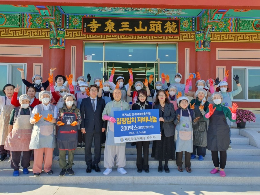 삼천사(주지 진철 스님)가 ‘김장김치 자비나눔’ 행사를 열고 5kg 김치 200박스(약 1,000만 원 상당)를 기탁했다고 제천시는 11월 14일 밝혔다.
